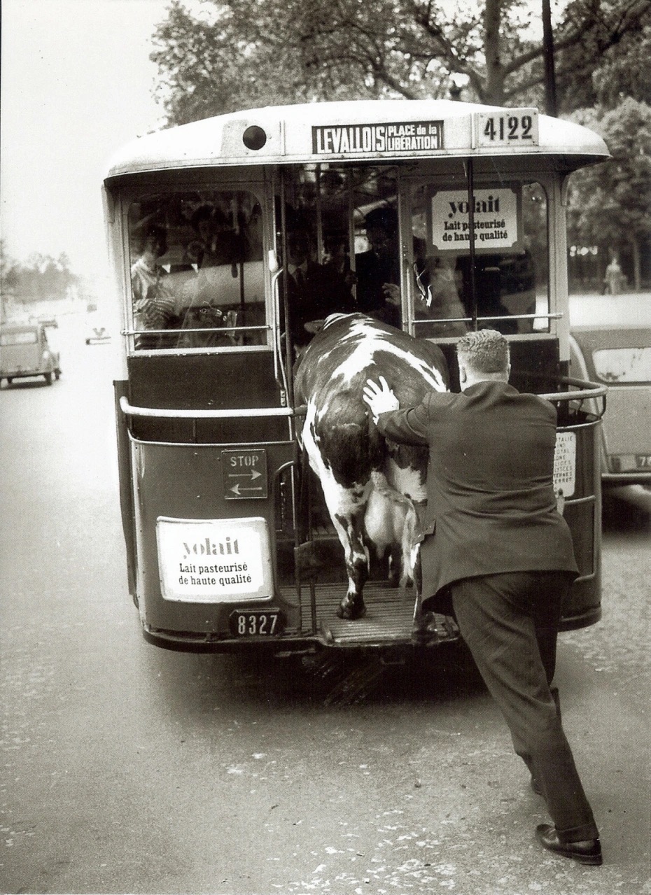 For the visually challenged writer, the image depicts the back of a French autobus on the street. It is filled with people. We also see the back of a man who is dressed in a suit. He is pushing a rather large female cow through an entrance to the bus.