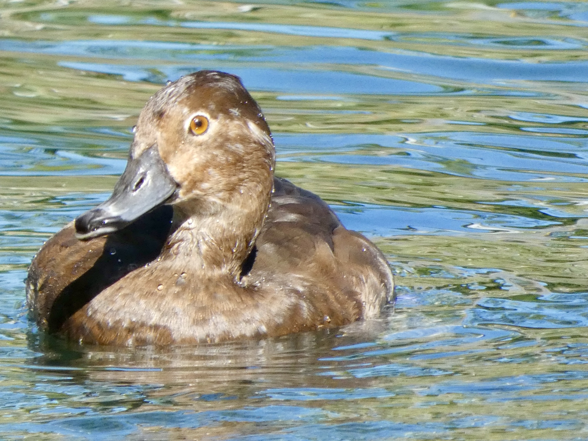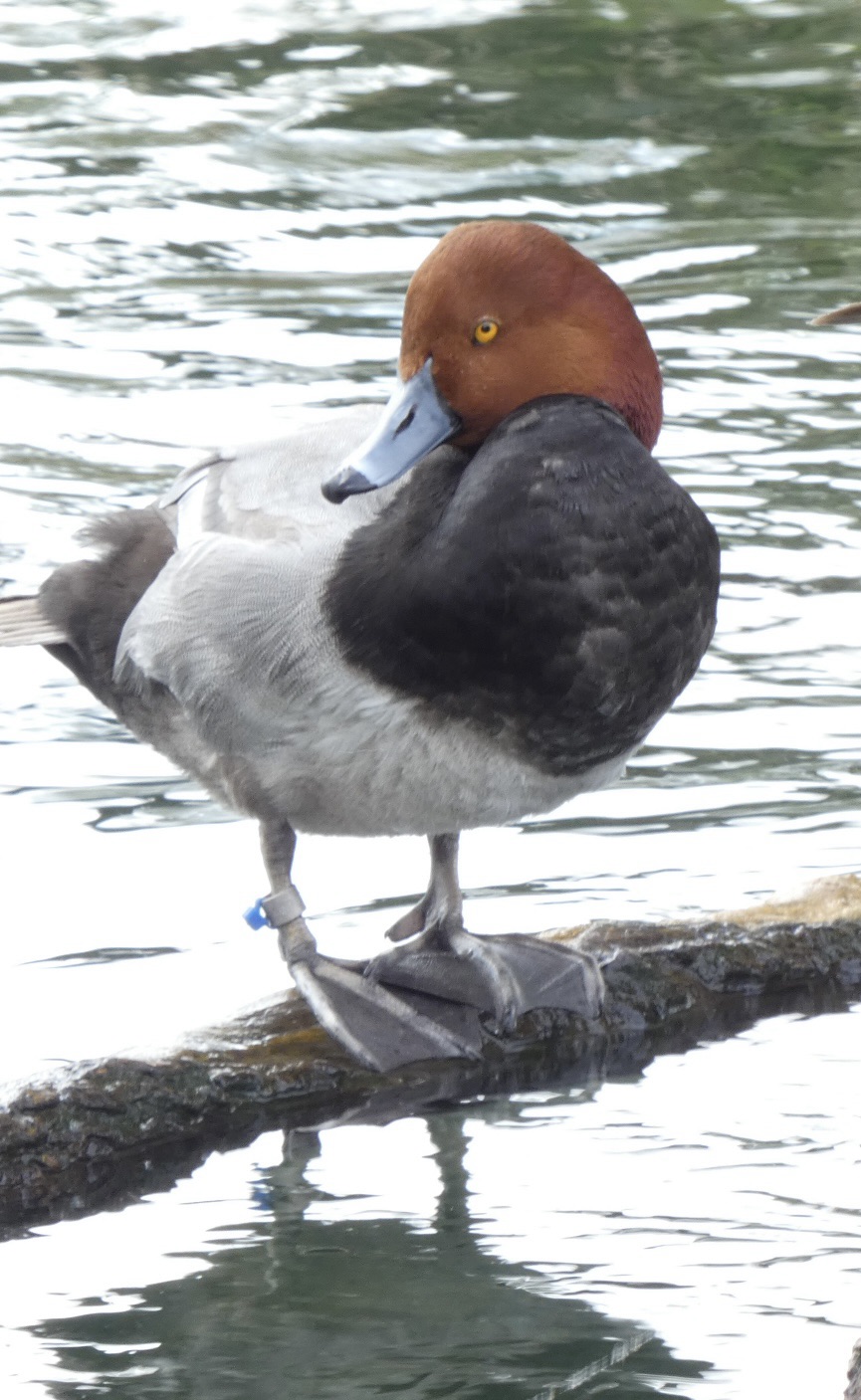 I photographed these North American diving ducks while they were wintering at a natural pond in the Miami zoo. Redheads tend to winter in the southern and eastern regions of the United States, Mexico and the Caribbean. Spring migration brings them further north and west in the U.S. and into Canada to breed. The male appears to be banded, which I assume is for research purposes.