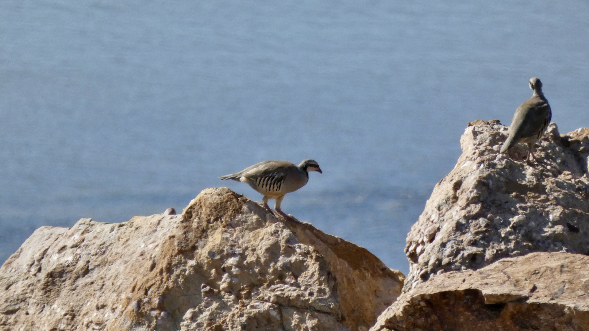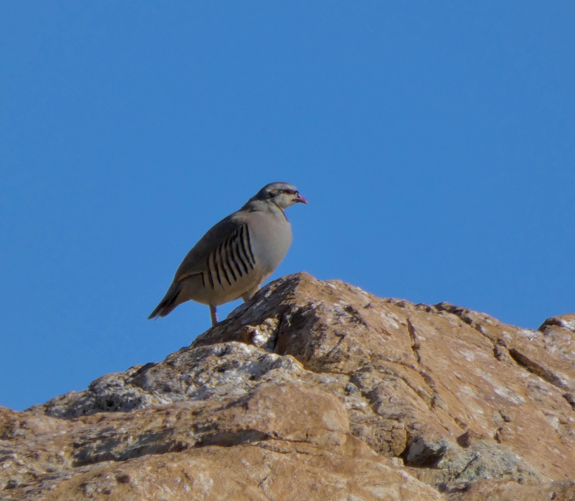 A steep hike up a rocky cliff for a better view of the Great Salt Lake. Strange bird sounds heard in the distance. Where are they coming from? We climb rock after rock seeing nothing, until we are startled by a covey of Chukar rising from the underbrush.