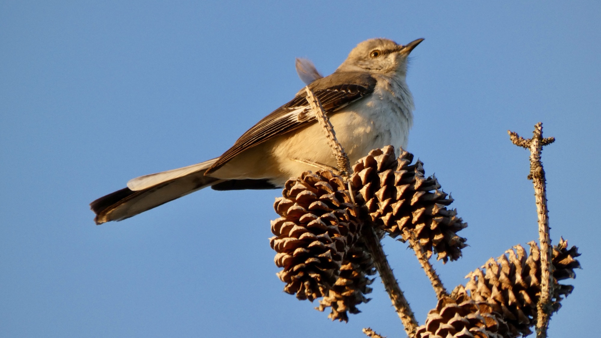 “Northern Mockingbirds can learn as many as 200 songs, and often mimic sounds in their environment including other birds, car alarms, and creaky gates. One theory is that if a female prefers males who sing more songs, a male can top his rivals by quickly adding to his repertoire some of the sounds around him.” CornellLab All About Birds